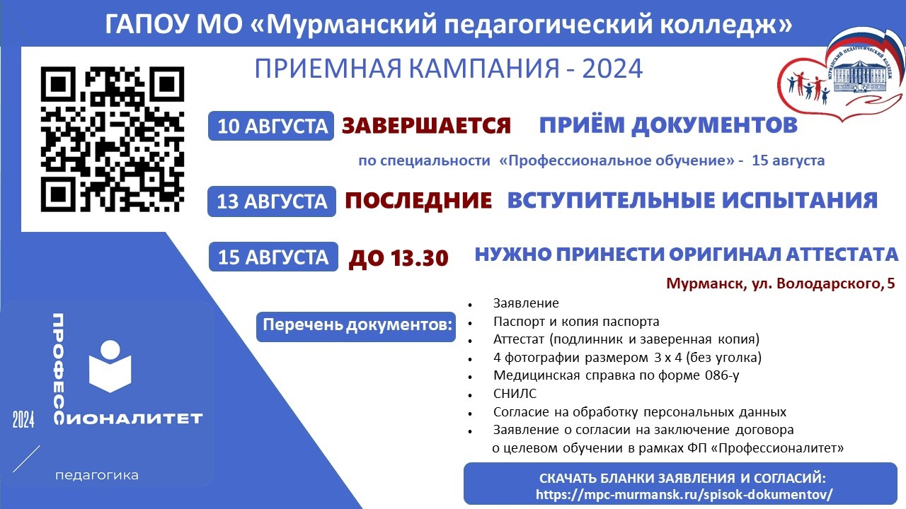 Напоминаем, что Приемная комиссия Мурманского педагогического колледжа работает до 15 августа 2024 года.