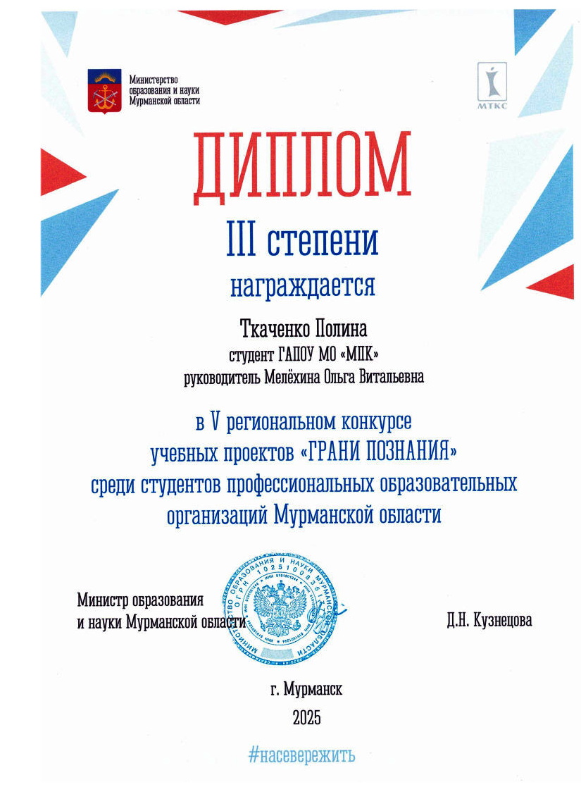 Студентка группы 2П3 Мурманского педагогического колледжа Полина Ткаченко успешно представила свою работу в секции «Информатика, математика, физика» и заняла почетное III место.