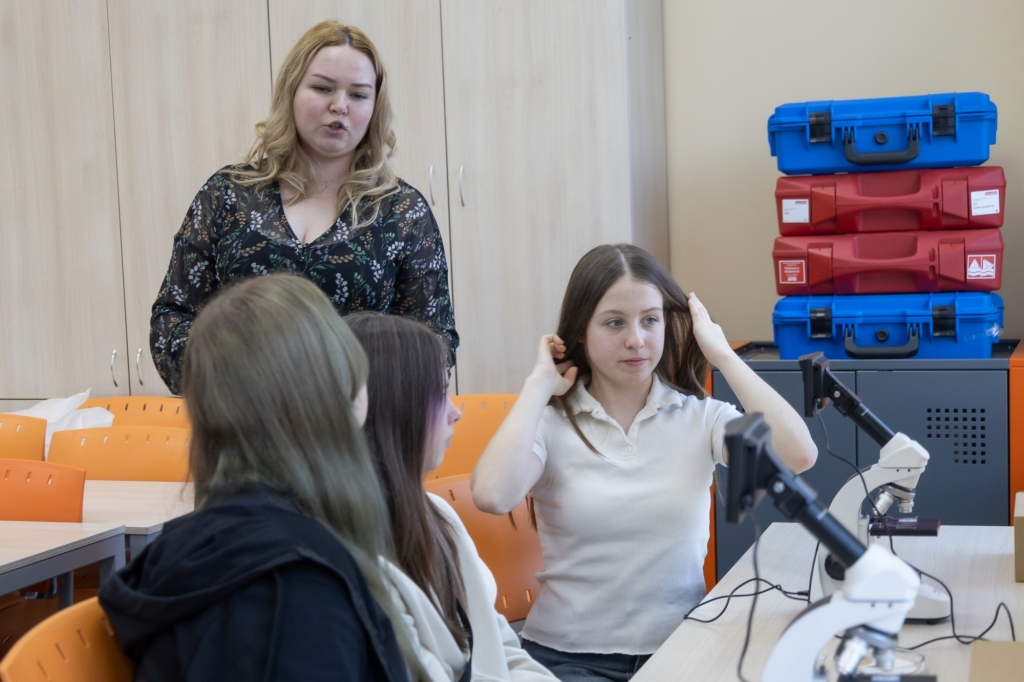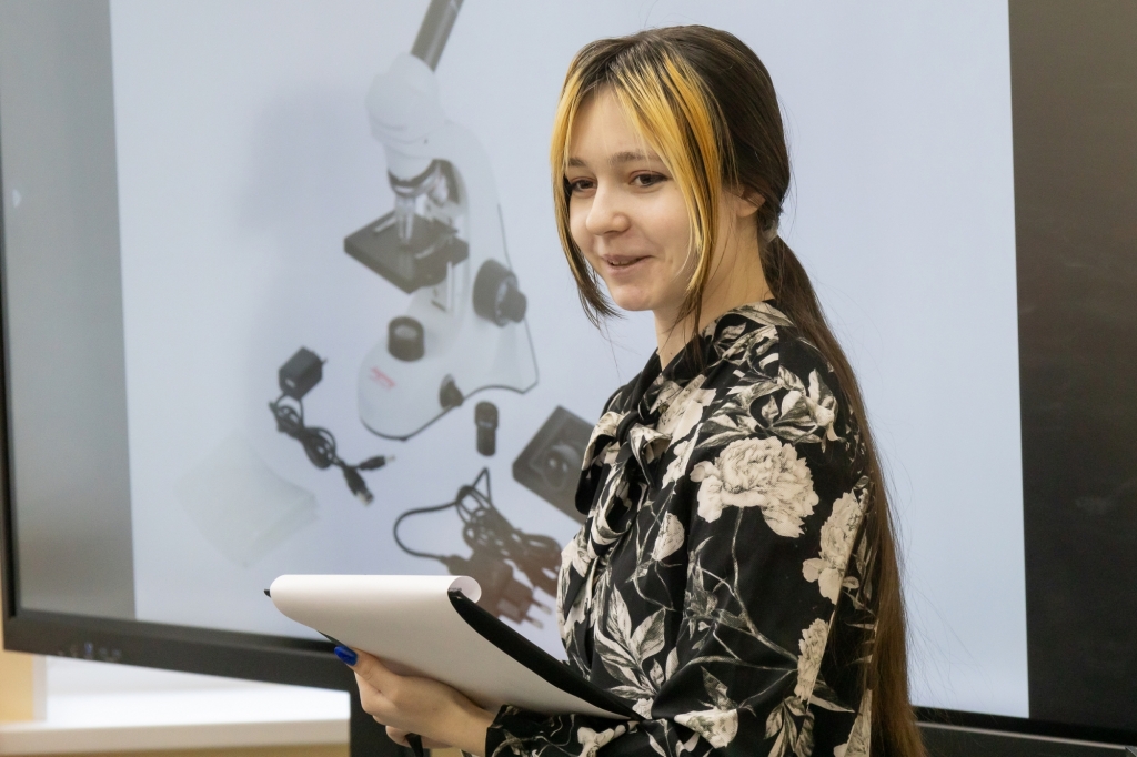 На лабораторном практикуме преподаватель колледжа Кристина Юрьевна Майер, студенты Анастасия Граур и Мария Крючек познакомили школьников МБОУ г. Мурманска СОШ № 42 имени Е.В. Шовского и МБОУ г. Мурманска СОШ № 45 с устройством и принципами работы цифрового микроскопа – современного инструмента, открывающего тайны микромира.
